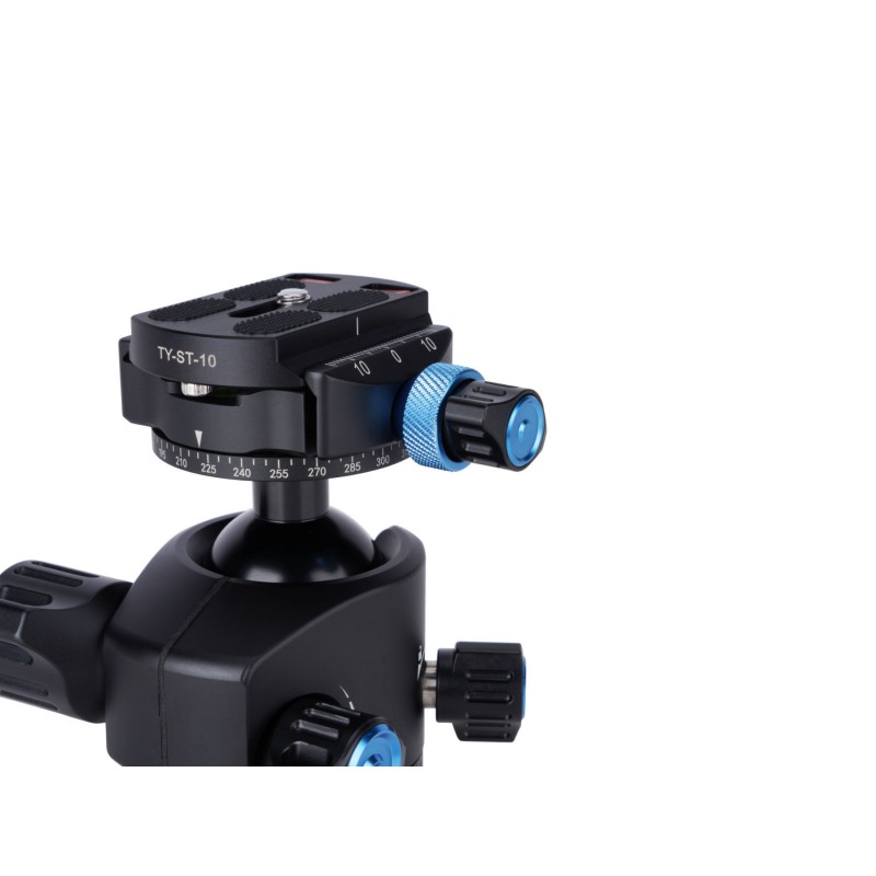 Un’altra caratteristica speciale di questo treppiede è che una gamba può essere rimossa e utilizzata come monopiede. La colonna centrale è realizzata a forma di triangolo per migliorare la rigidità e consente inoltre di avere un profilo estremamente sottile quando piegato. Le gambe hanno tre posizioni per consentire diverse angolazioni ed estensioni. Il treppiede misura solo 42 cm quando è chiuso. Ogni gamba è composta da 5 sezioni con 3 serrature a torsione sigillate. I piedini in gomma e le punte in metallo assicurano che il treppiede sia stabile su qualsiasi superficie.