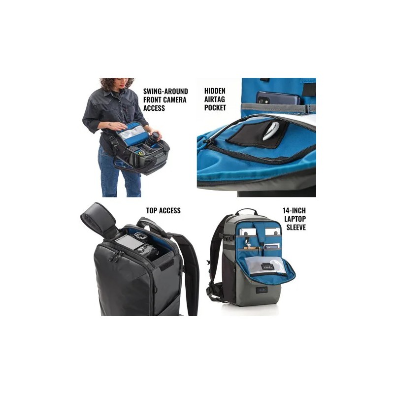 Questo zaino da 20 litri può contenere 1-2 fotocamere mirrorless o DSLR con 5-8 obiettivi, inclusa una combinazione fotocamera/obiettivo fino a 16,5 pollici (42 cm) di lunghezza, più un tablet fino a 8 pollici (es. iPad Mini). È adatto a obiettivi come Sony 200-600mm, Canon 200-800mm, Nikon 180-600mm e Tamron/Sigma 150-600mm o DJI Mavic e altri droni compatti. Il comodo accesso posteriore consente allo zaino di restare appeso al corpo come un banco da lavoro galleggiante, è inoltre presente un accesso superiore. Le due tasche laterali possono contenere una bottiglia d'acqua grande o un treppiede compatto. È presente anche una tasca nascosta per inserire un Apple AirTag o altro tracker Bluetooth ed è inclusa una copertura antipioggia WeatherWrap rimovibile per una protezione extra nelle giornate di pioggia.